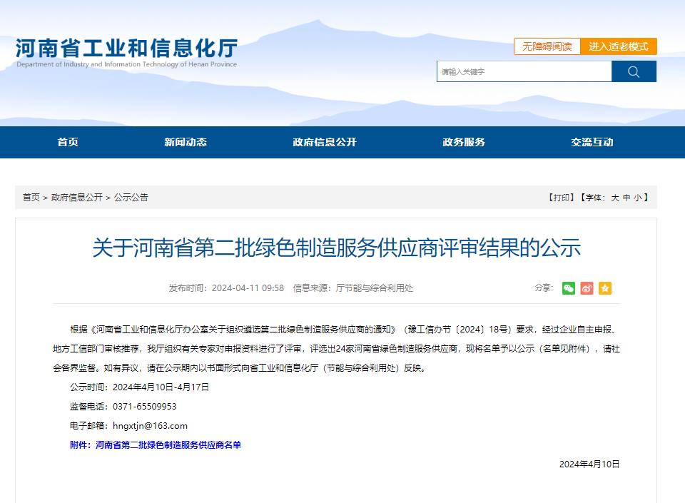 近日,河南省工信廳公示河南省第二批綠色制造服務供應商名單,河南銀金達新材料股份有限公司在列。
