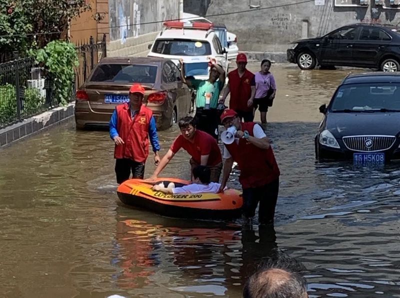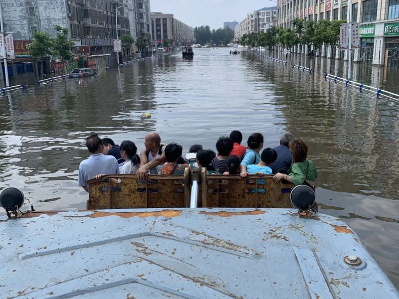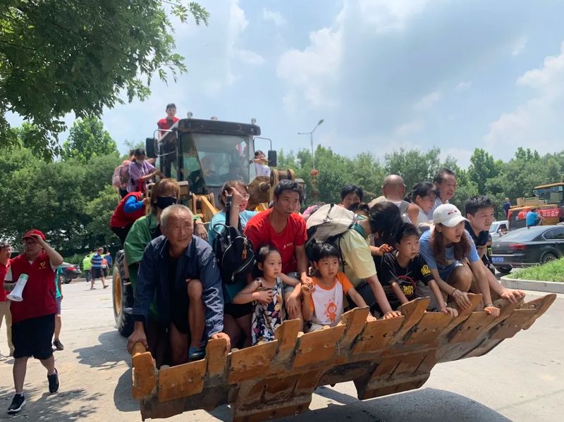 3、李沅鴻領(lǐng)隊12人出動2輛鏟車、2艘橡皮船、2輛班車、1輛集裝箱車水中救援職工及其家屬和受災(zāi)群眾,運(yùn)送至銀金達(dá)安置點(diǎn),并參加李良屯護(hù)堤防汛;