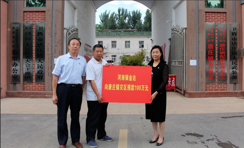 黨委書記、董事長閆銀鳳代表河南銀金達(dá)集團(tuán)向唐莊鎮(zhèn)人民政府捐資100萬元;